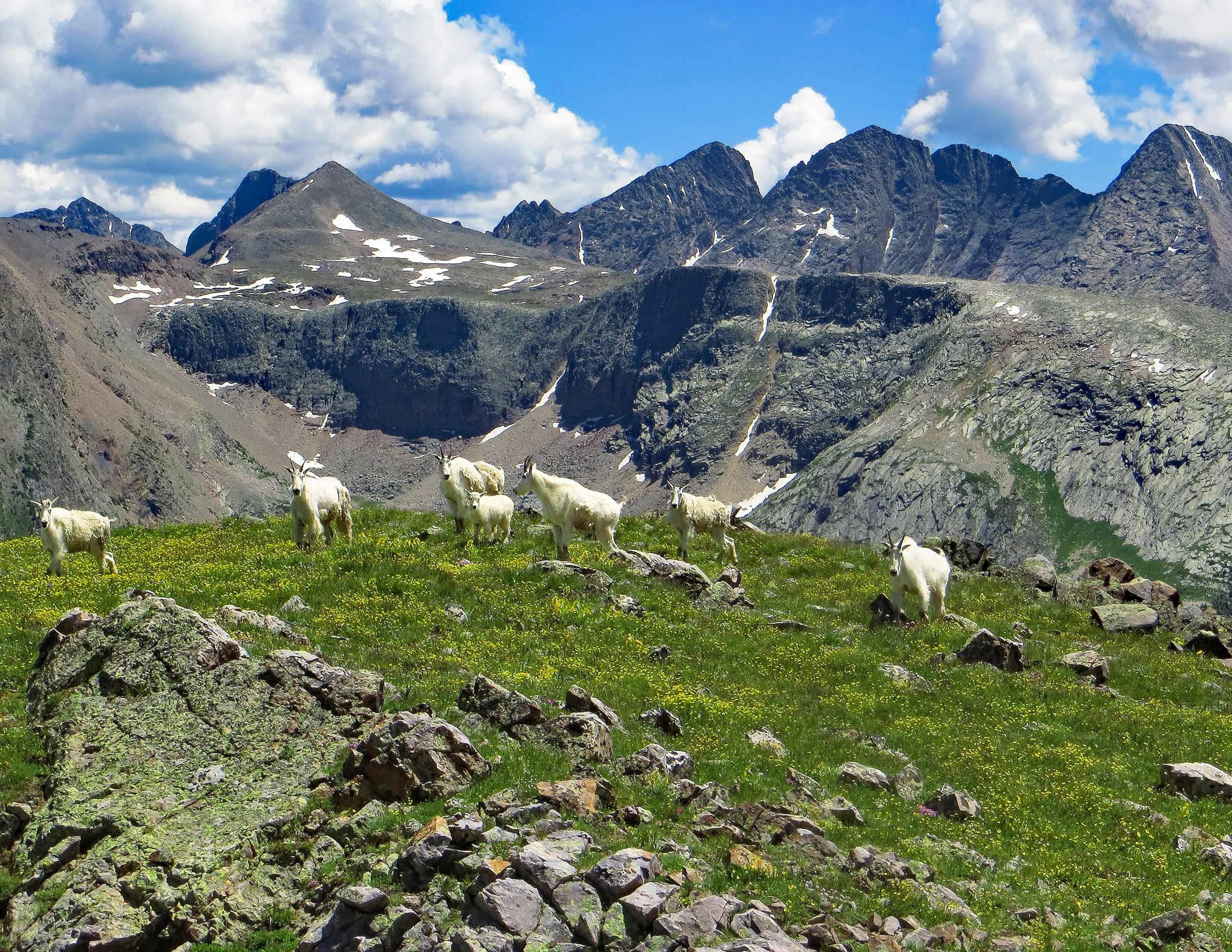 The mountain goat (Oreamnos americanus) is endemic to the northern Rocky Mountain west but had to be reintroduced to Colorado. From 1948 to 1972, six transplant operations released an original group of 55 – 60 goats. By 2005, their population had grown to over 2,000. Today, their range can be found throughout the state. Because of frequent backcountry visitation on the Front range by hikers, climbers, etc., the goats in that area are generally accepting of human presence, but in more remote mountain areas like the San Juans, goats remain elusive and avoid human contact.